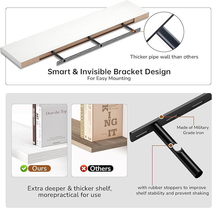 - Extra Deeper & Thicker - This wall shelf measures 48"W x 10.23"D x 1.8"H. Extra deeper and thicker design in order to bring maximizes storage space and weight capacity, even hold up to 75 lb. This floating shelf taking up zero square feet, reduces clutter and highlights dÃĐcor in compact spaces.
