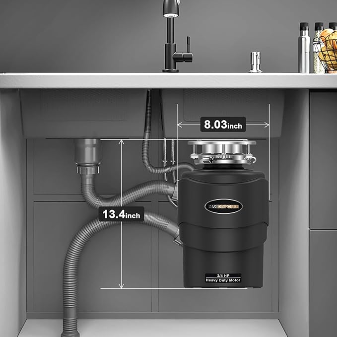 Garbage Disposal 3/4 HP Ultra Quiet powerful grinding Kitchen Food Waste Disposer with Power Cord Easy install, AC Motor Unit Continuous Feed Stainless Steel Grind 0.75 Horsepower (MAX-5)