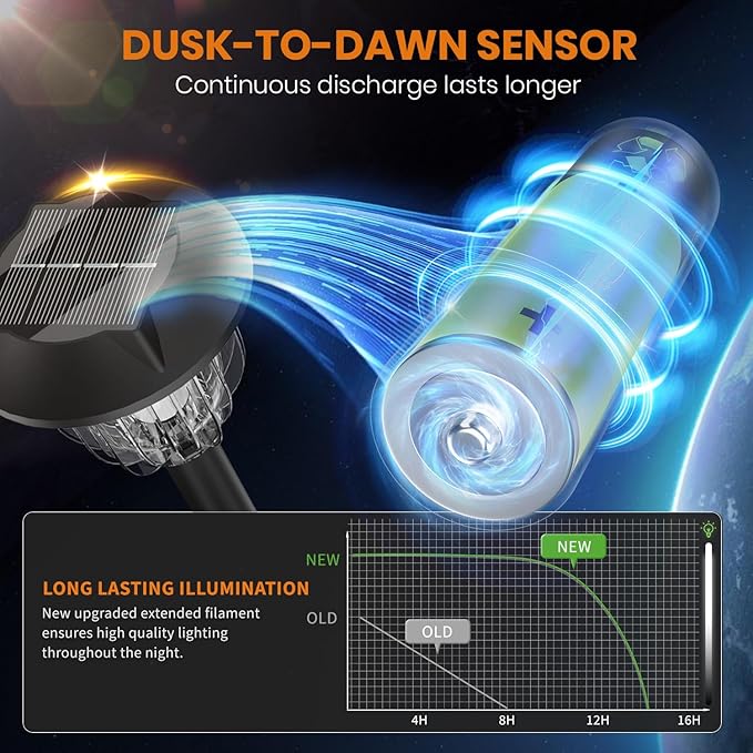 - DUSK TO DAWN LIGHT UP LANDSCAPE LIGHTING: Solar power lights automatically turn on at night and turn off at dawn which enables led pathway light conserves battery life for when itâs needed most. The lights provide a good amount of illumination after a sunny day.
