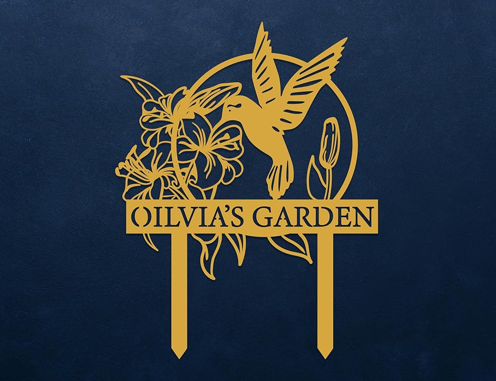 Custom Hummingbird Metal Garden Decor, Personalized Bird with Stakes Garden Sign, Flower Design Personalized Garden Sign, Custom Garden Name Sign, Home Gift, Large Outdoor Decor, Patio Decor