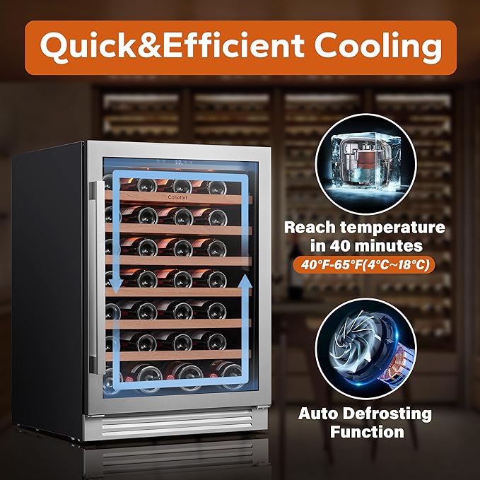 - 【Perfect companion for wine】Ca'Lefort Wine Fridge 5.65 cu.ft capacity holds at least 54 bottles of wine (standard 750ml). The minimum temperature is 40°F, with the smart digital panel, you can adjust the temperature accurately by 1°F. The hardness, eco-friendly and durable removable shelves (made of sapele wood) make it easy to access the red wines, and by adjusting the shelves, you can place different sizes of red wines. You can choose the amber/blue/white LED according to different moods.