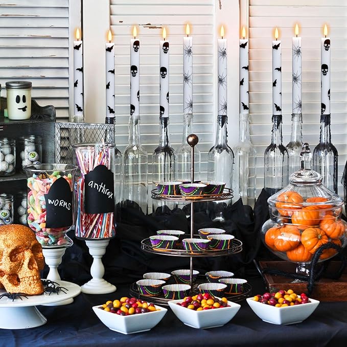 - Package Included: This value pack comes with 6 x flickering flameless taper candles, 1 x 10-key remote control, and a super easy-to-follow operating manual. Specifically, this set includes 6 x taper candles (2 x spider web candles, 2 x bat candles, 2 x skull taper candles, 9.64-inch high x 0.78-inch diameter). Each candle is operated by 2 AAA batteries(not included).