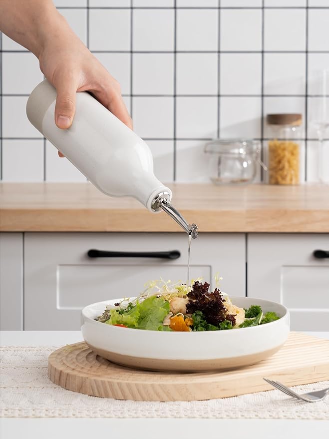 - ELEGANT OLIVE OIL DISPENSER BOTTLE - Our ceramic oil dispenser is handmade and batch fired at extremely high temperatures, forming a smooth glaze and providing a resilient surface for strength and durability, easy to clean and dishwasher safe for long-term use