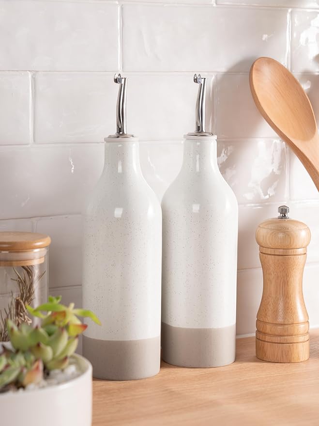 - ELEGANT OLIVE OIL DISPENSER BOTTLE - Our ceramic oil dispenser is handmade and batch fired at extremely high temperatures, forming a smooth glaze and providing a resilient surface for strength and durability, easy to clean and dishwasher safe for long-term use
