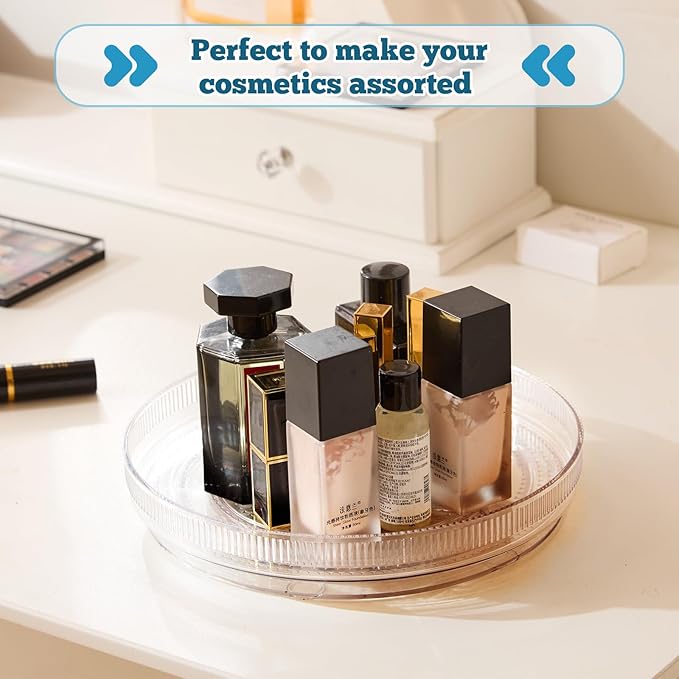 • MULTIPURPOSE ORGANIZER: This versatile Lazy Susan turntable is perfect for a variety of uses. Organize your spices, seasonings, snacks or even display items on a shelf. It also serves as a stylish cosmetics, perfumes holder or a bathroom organizer, keeping your desktop neat and tidy.