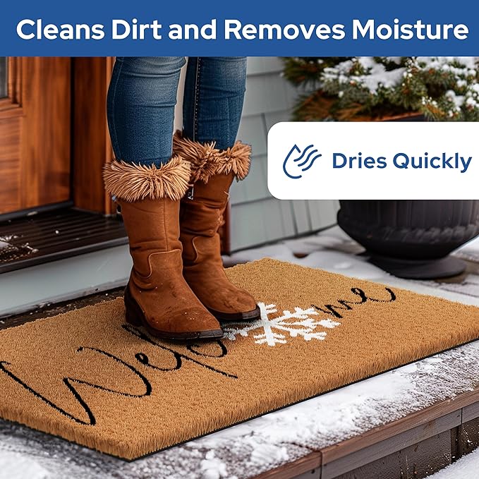 - Versatile - Our Snowflake Welcome winter door mat outdoor entrances is not only perfect for patios, but also makes a great welcome mat for outdoor events or camping trips. Its durable construction is perfect for cleaning dirt and debris from shoes, and the all-weather coir fibers dry quickly. Use it to welcome guests to your home, cabin, or RV.