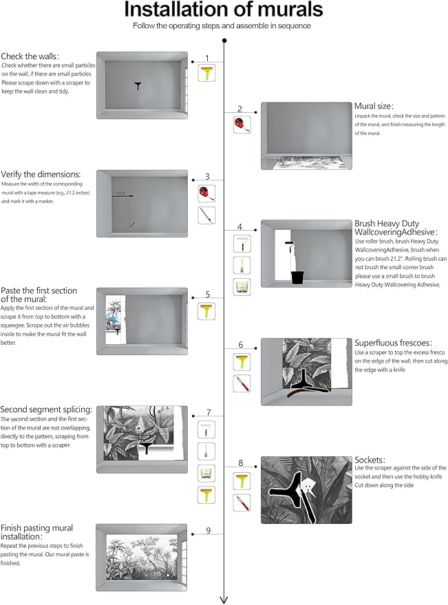 • Construction Installation: Each part of the mural is marked with a serial number underneath, no overlap, direct docking, in order. (Please refer to installation instructions)