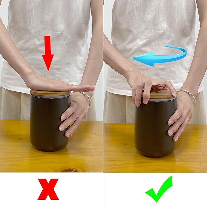 - Easy to Refill & Clean: The wide-mouth design allows for quick scooping, refilling, or cleaning. The ceramic jar is dishwasher safe, while the bamboo lid must be hand washed and dried promptly. Tips; To ensure proper sealing, press the lid downward while twisting it at the same timeâdo not push it straight down without rotation.