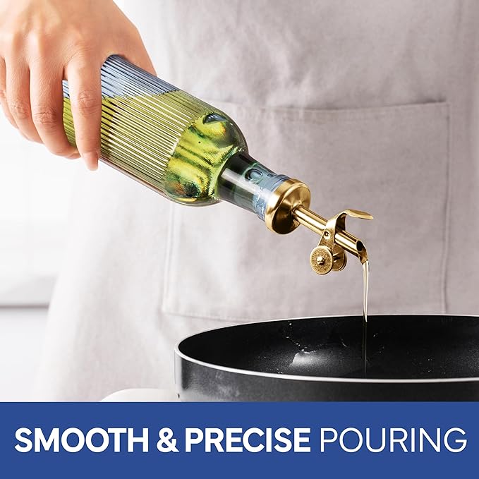 • Beautiful and Functional - Our colored glass oil dispensing bottles, with elegeant colors, gold tops and gold wire rack, will elevate your kitchen. Don't use just any oil bottle, upgrade the way you cook. That's our mission.