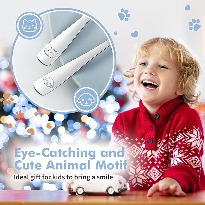 - ENGAGING MEALTIMES: Our kids silverware set embossed with a mirror-polished finish and adorable animal motifs. Your child will be excited to dine with a kitten on the spoon and a pup on the fork, turning mealtime into a fun and engaging experience