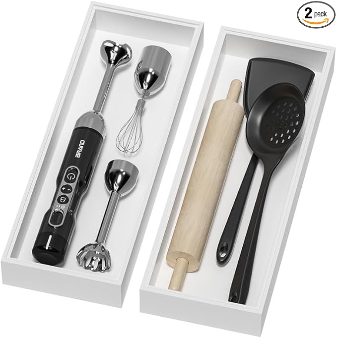 - Premium Bamboo Kitchen Drawer Organizer: Both 2 kitchen utensil organizer is made of sleek durable natural bamboo that is known to be stronger and beautiful than regular wood and to ensure durability and stability. Must have kitchen drawer organizer to organize silverware, utensil, cutlery and flatware like spoon. Or used on kitchen countertop to storage spice jars, sauces, bottles, etc.