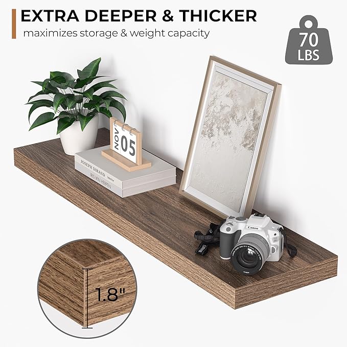 - Extra Deeper & Thicker - This wall shelf measures 36"W x 10.23"D x 1.8"H. Extra deeper and thicker design in order to bring maximizes storage space and weight capacity, even hold up to 70 lb. This floating shelf taking up zero square feet, reduces clutter and highlights dÃĐcor in compact spaces.