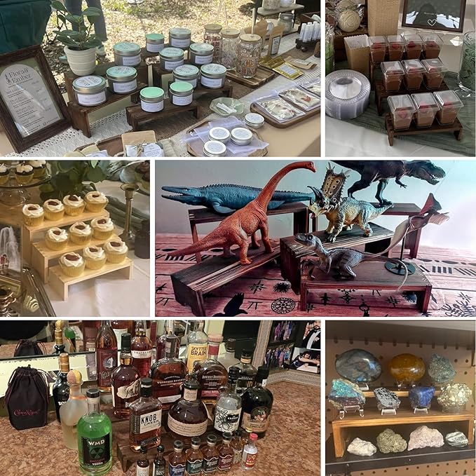 - ใWooden Tierd Risers for Displayใ๐: This 4 set 3 tier small display shelf for cupcakes or vendors has stackable nesting design, so the wooden display risers easily access as desktop storage racks,also they has strong load-bearing capacity for more kinds perfumes, collectible figures,kitchen condiment bottles, bathroom toiletries because of varieties size of (L7.8''/20cm-8.6''/22cm-9.4''/24cm)XW2.9'' /7.3cm