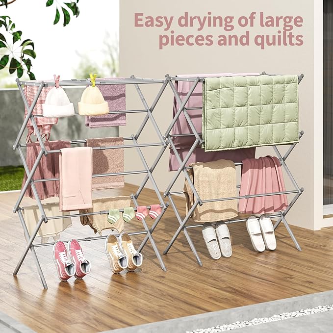 • Expandable Design: The 3-tier laundry drying rack features 11 steel drying rods that can be extended from 17.13 to 29.33 inches in length, providing ample drying space for towels, clothes, sweaters, and more.