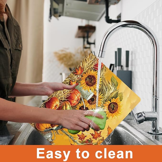 - Easy to clean:Crafted with your convenience in mind, these Autumn farmhouse rustic placemats are a breeze to clean. Just give them a quick wipe or gently hand wash to eliminate spills or stains, and they'll be ready for your next gathering. No need to fret about time-consuming maintenance, as these Thanksgiving table mats are resistant to fading and shrinking.