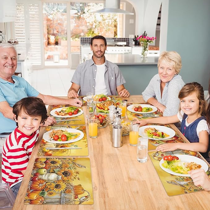 - Suitable for various occasions:Whether you're hosting a formal dinner, a casual get-together, or a festive celebration, these Thanksgiving pumpkin table placemats are essential.Sunflowers pumpkin table placemats adaptable design and neutral color palette complement a variety of table settings, making them perfect for a wide range of occasions and themes.