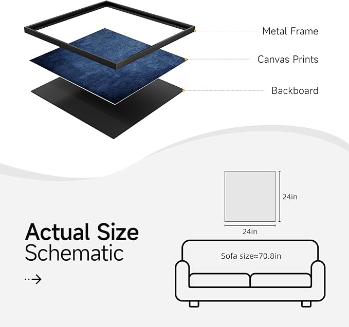 • [Framed Wall Art]: This navy blue modern abstract framed wall art measures 24x24 inches. Each painting with a solid, rust-resistant, simple and stylish black frame that blends in perfectly with a variety of decor styles.