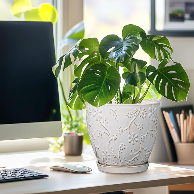 • Stylish Appearance: Our ceramic planter has a white main colour, a beautiful embossed petal and leaf pattern on the surface, elegant appearance making it ideal for home decor, garden decor and office decor