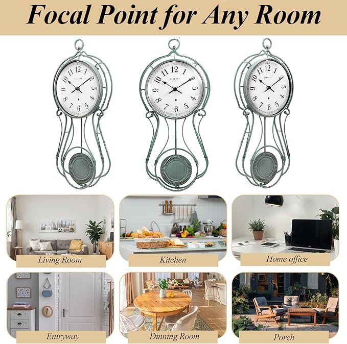 - 【Functional Decorative Pendulum Wall Clock】: Our modern pendulum wall clock features a hand brused aged teal green finish, making it a perfect addition to any living room decor. This large pendulum wall clock combines classic charm with a contemporary aesthetic, enhancing your space