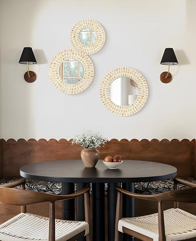 - HANDMADE, NATURAL WALL DECOR - Handcrafted from real mother of pearl by our experienced craftsmen, this unique mirror wall art set adds distinctive flair to your living or working space. Light, airy tone makes this wall mounted mirror fit in boho, coastal, modern, farmhouse and any other styles nicely, delivering maximum comfort and tranquility. [Note: Because the cut pieces are put on individually by hand, items received may be slightly different from pictures shown]