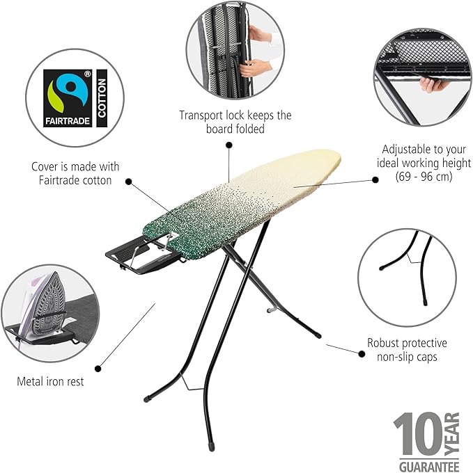 • High-Quality Materials and Design: Features a 100% Fairtrade cotton cover for a smooth, durable ironing surface, supported by a resilient foam layer for added comfort; The Stretch-System ensures a perfect, crease-free fit for efficient ironing