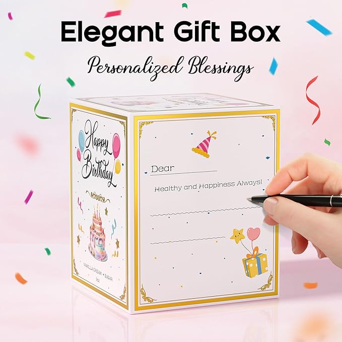 • Happy Birthday Candle: VEGISHINE Happy Birthday Candle, infused with the delightful scent of vanilla cream cake and sprinkled with candy accents. Featuring "Happy Birthday" on the candle, it’s more than just a gift—it’s a heartfelt expression of anticipation and joyful surprises.