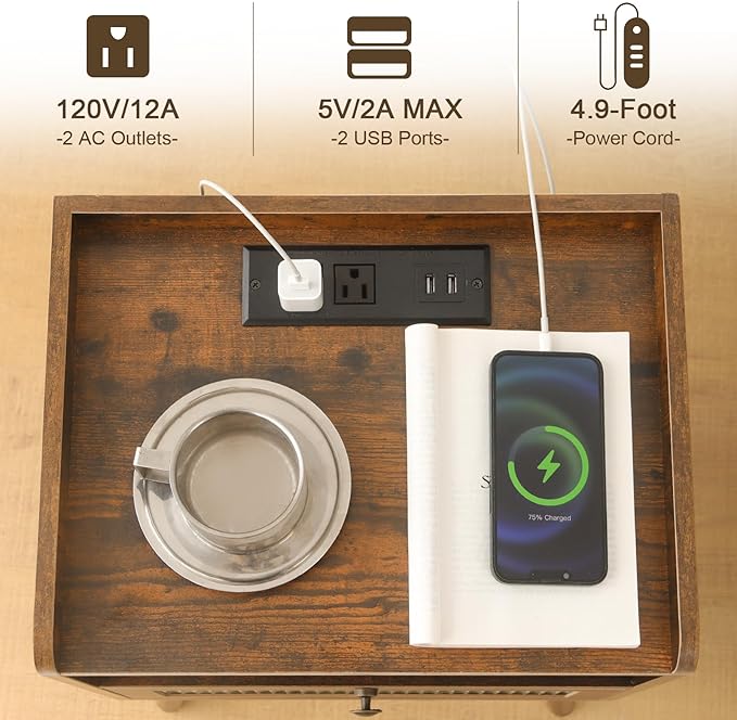 - Multifunctional Nightstand: This mid century night stand with the charging station is equipped with 2 USB Ports and 2Ã3-Prong Power Outlets that can meet your needs to charge phones, iPads, laptops, and desk lamps easily. The 4.9-foot-long electrical cord makes phones, and ipads when charging that also is within your armâs reach