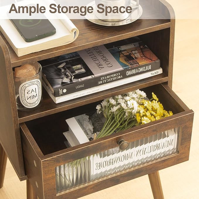 AWASEN Mid Century Night Stand with Charging Station, Wood Bedside Table with Glass Drawer, Small Modern Nightstand End Side Table with 2 Tiers Storage for Bedroom, Office(Rustic Brown)
