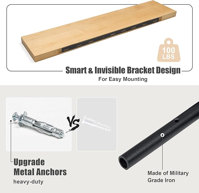 - STURDY & FUNCTIONAL: Not only does the floating shelf showcase the natural grain pattern of the wood, but with unique heavy-duty metal mounting brackets, our floating shelf can hold up to 100 lbs per shelf. The shelves have a flat surface and stable construction, so they are suitable for any room in your home.