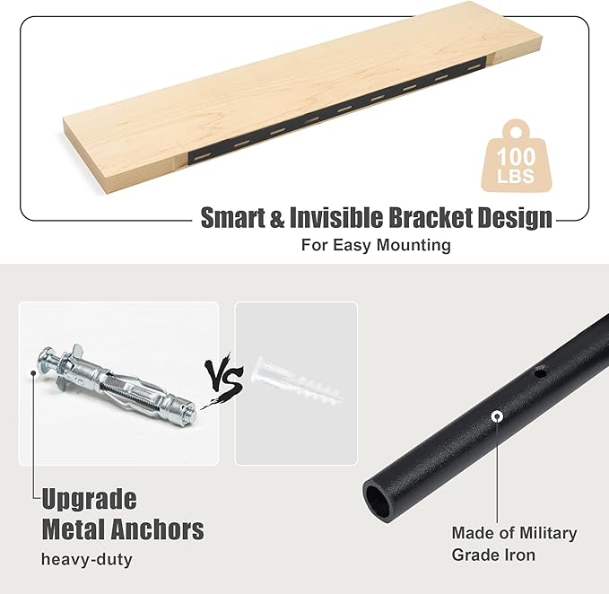 - STURDY & FUNCTIONAL: Not only does the floating shelf showcase the natural grain pattern of the wood, but with unique heavy-duty metal mounting brackets, our floating shelf can hold up to 100 lbs per shelf. The shelves have a flat surface and stable construction, so they are suitable for any room in your home.