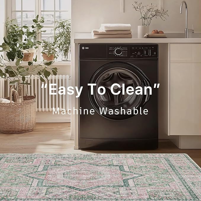 DCX Washable 8x10 Area Rug, Soft Machine Washable Non Slip with Rubber Backing Vintage Rug, Kid & Pet Friendly Living Room Area Rugs 8x10, Foldable Rugs for Bedroom Dining Room Office-Pink & Green