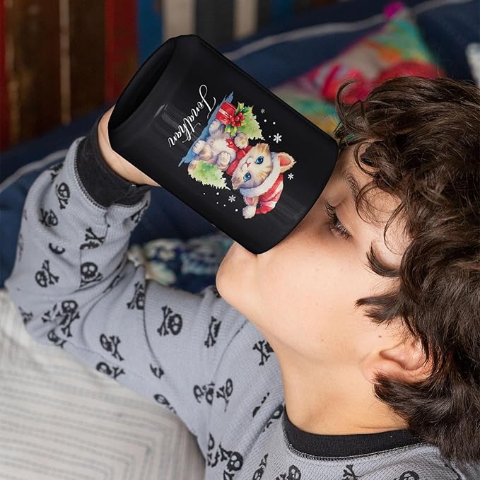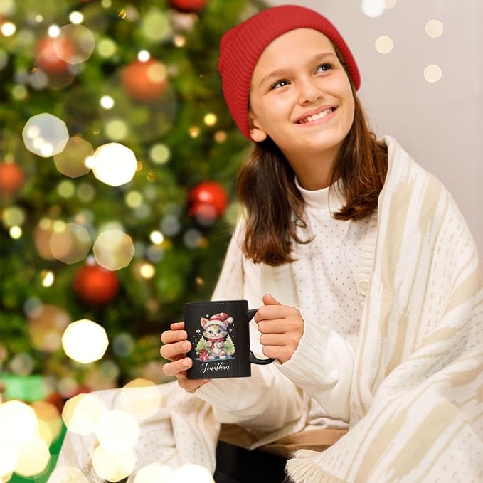- ð UNIQUE DESIGN MUG: Delight a cat lover with this "Cute Christmas Cat Cup" featuring an adorable cat in a Santa hat surrounded by festive trees and a gift. Click "Customize Now" to add a name, making it a charming holiday gift for friends and family. This black ceramic mug is great for enjoying warm beverages during the Christmas season.