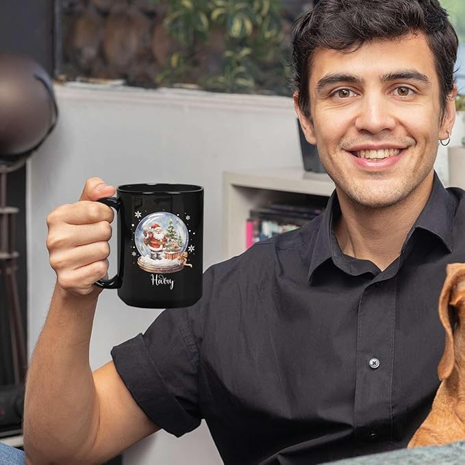 - ð UNIQUE DESIGN MUG: Bring holiday joy with this "Custom Snow Ball Design Mug With Name" featuring a festive Santa inside a sparkling snow globe with gifts and a Christmas tree. Click "Customize Now" to personalize with a name and create a unique gift for spreading holiday cheer. This black ceramic mug is ideal for enjoying your favorite seasonal beverages.