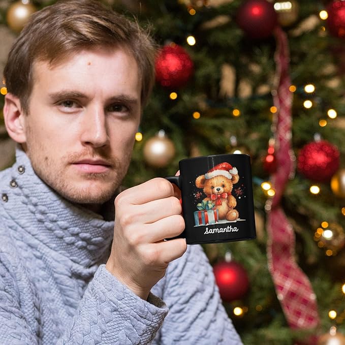 - ð UNIQUE DESIGN MUG: Spread holiday cheer with this "Custom Name Xmas Teddy Bear Cup" featuring a cute teddy bear in a Santa hat beside a festive gift. Click "Customize Now" to add a name, making it a personalized gift for the holiday season. This black ceramic mug is ideal for enjoying warm winter drinks in a cozy setting.