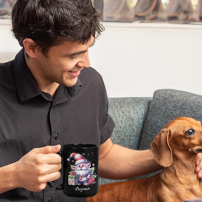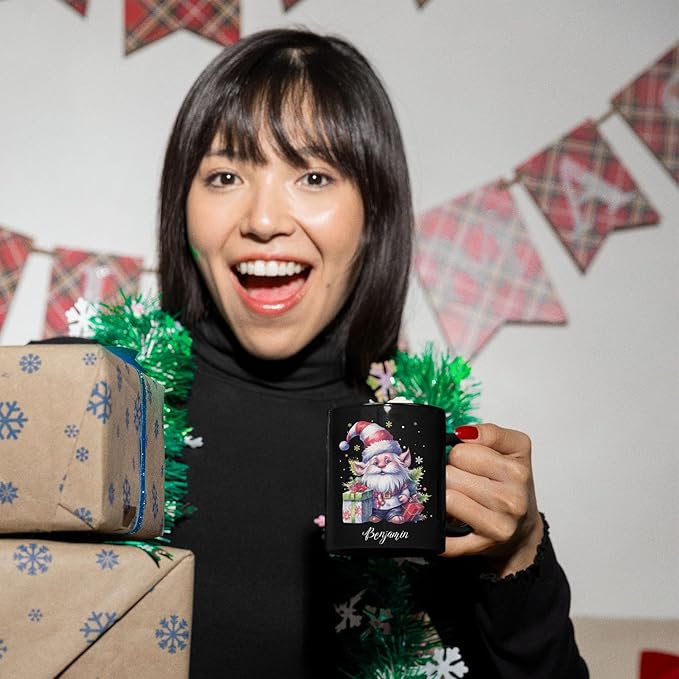 - ð UNIQUE DESIGN MUG: Add some festive fun to your holidays with this "Cute Gnome And Gifts Design Mug" featuring an adorable gnome holding gifts. Click "Customize Now" to add a name, making it a great personalized gift for gnome lovers. This black ceramic mug is ideal for enjoying drinks during the Christmas season.
