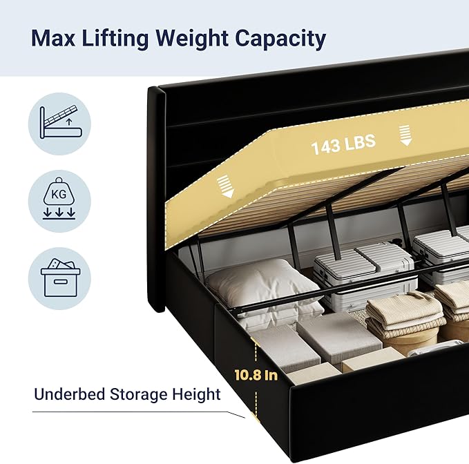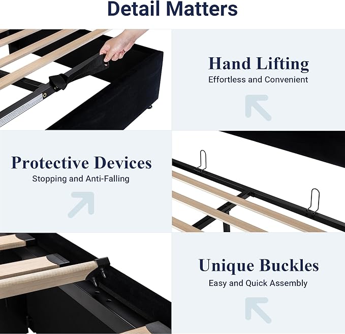 • Space-Saving Storage: With its lifting up storage feature, this bed frame provides ample space to store extra bedding, clothing, shoes, and other items, especially helpful for smaller bedrooms or apartments where storage space is limited