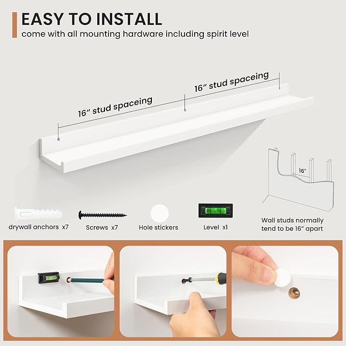 - Enhanced Stability Design: Featuring a secure lip at the front, these floating shelves prevent items from slipping or falling, confidently supporting up to 45 lbs, making these MDF wood shelves ideal for showcasing cherished items.
