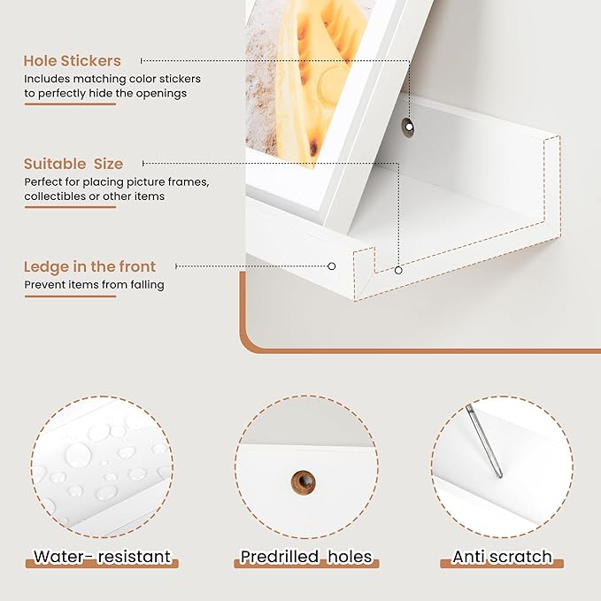 - Enhanced Stability Design: Featuring a secure lip at the front, these floating shelves prevent items from slipping or falling, confidently supporting up to 65 lbs, making these MDF wood shelves ideal for showcasing cherished items.