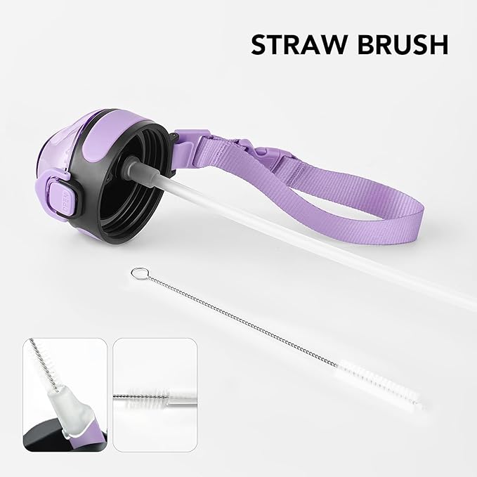 - Humanized Design: The one-hand operation button allows for easy access to water. Highly suitable for boys and girls, and all ages. The flip-top lid of the insulated bottle is used a secure lock, making it dust-free and leak-proof. The included straw brush makes maintaining your bottle's cleanliness uncomplicated and efficient.