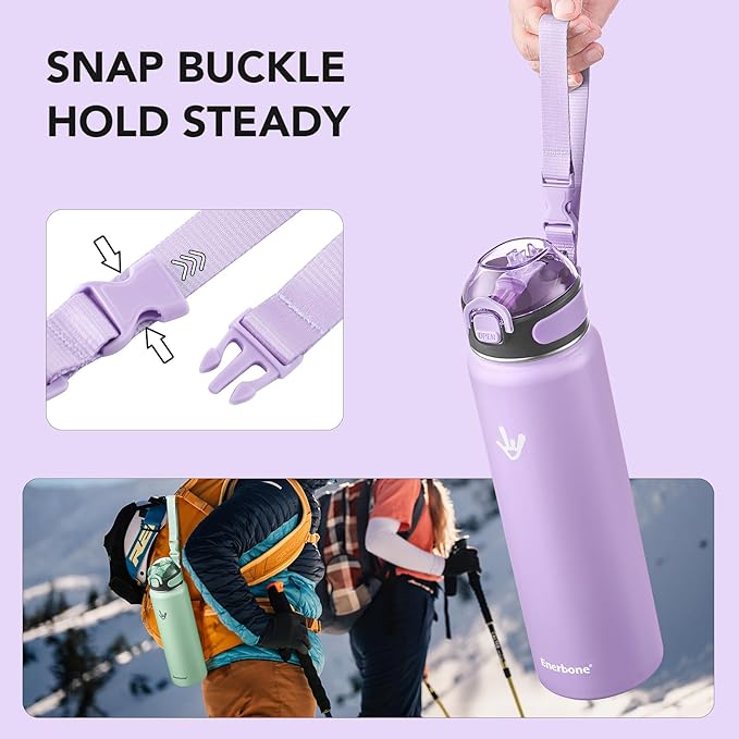 Enerbone 32 oz Insulated Water Bottle, Stainless Steel Bottle with Carrying Strap, Double-Wall Vacuum Insulation Design, Leakproof Sports Bottle with Straw, Keep Drinks Cold or Hot for Hours