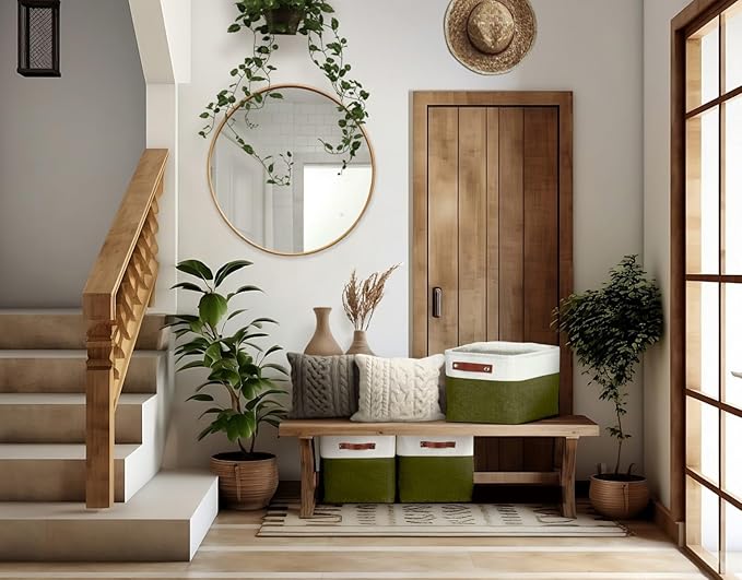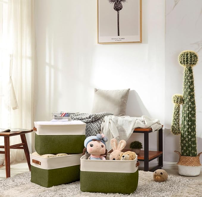 DECOMOMO Storage Bins Fabric Storage Baskets for Shelves, Linen Closet Organization Toys Nursery (Olive Green and White, Large - 3 Pack)