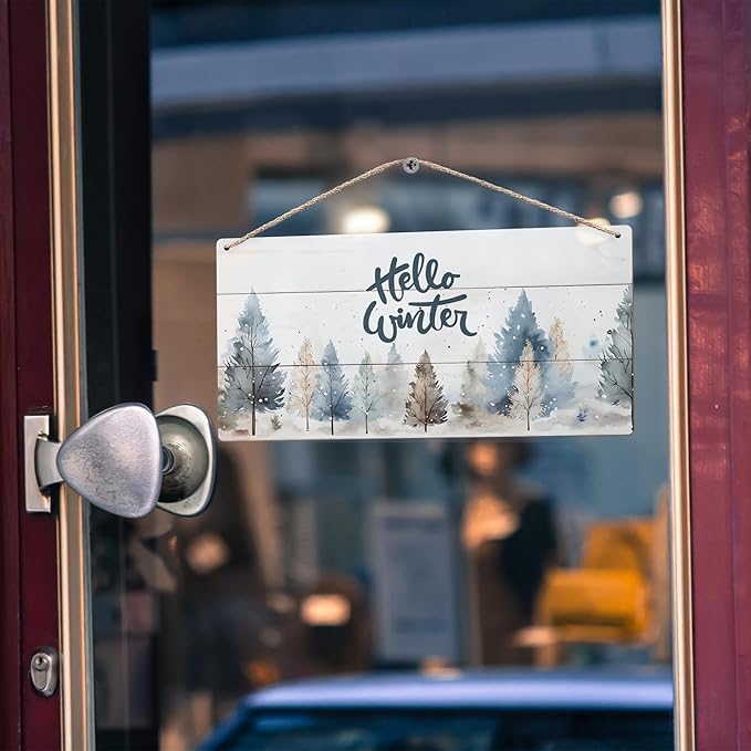DUXMNAMG Hello Winter Welcome Hanging Wooden Signs 12x6, Pine Tree Decor, Winter Door Decorations, Winter Door Sign, Rustic Winter Christmas Snowflakes Trees Home Room Office Hanging Wall Decor
