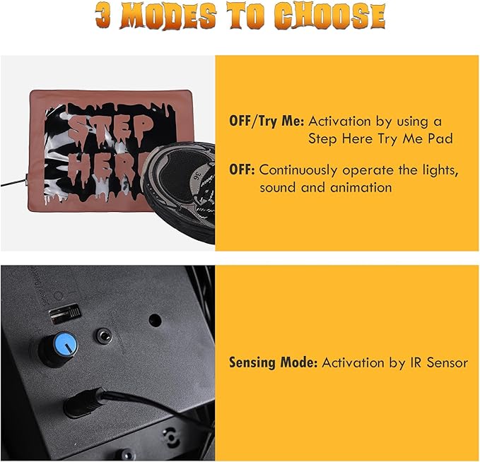 • 3 Activation Modes - Comes with a control box providing 3-mode control including Sensing Mode, Try Me, and ON, you can switch to ON to continuously operate the lights, sound, and animation, choose Try Me for foot pedal control, and Sensing Mode to activate IR sensor