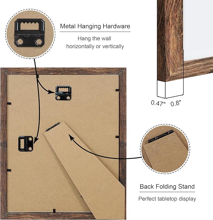 • Multiple Display:8 by 10 photo frames come with hanging hardware, which can be hung horizontally or vertically on the wall, or displayed on the tabletop through the stand