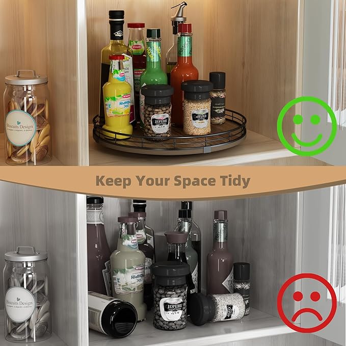 - 360ยฐSmooth Rotation - The lazy susan turntable rotates smoothly and silently, placed next to the stove for easy access to condiments, spices, olive oil and cooking supplies. Placed next to the sink to display soap lotion. Thoughtful kitchen countertop organizers to rid your life of clutter!