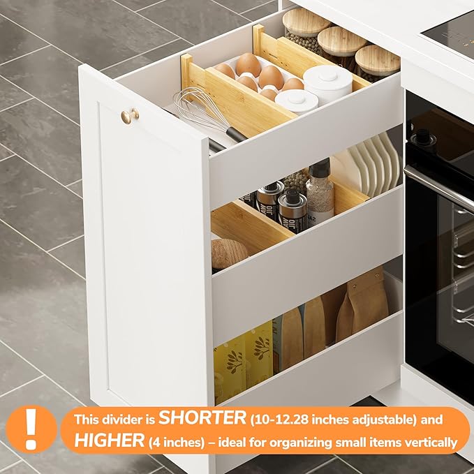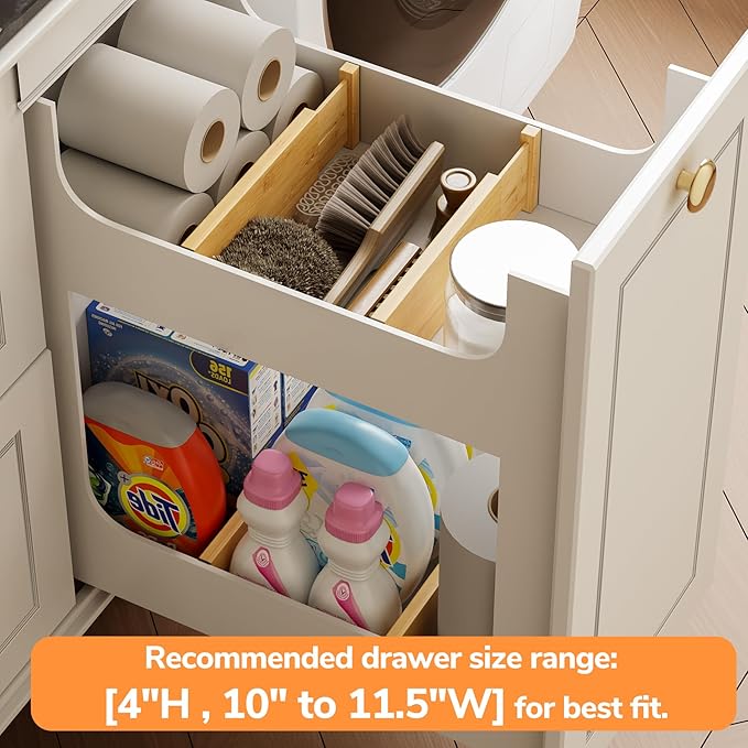 - Expandable design: Each deep drawer divider is 4" H, 0.6"W, and 10" to 12.28"L, which can be adjusted according to the size of the drawer, adapting to different furniture needs. Fits at least 4"H & 10-11.5"W drawers. Do not overstretchâmay reduce elasticity if extended beyond recommended length.