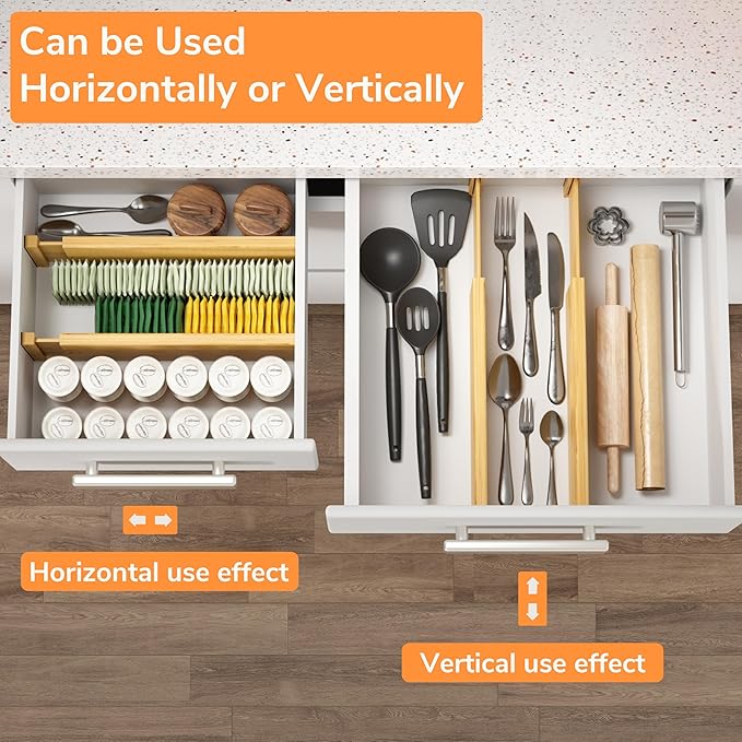 • No Need to Install: This kitchen drawer dividers have a built-in spring structure that eliminate the need for tedious installation steps; Simply push it gently and squeeze both sides inward, the pin comes off instantly and is ready for use