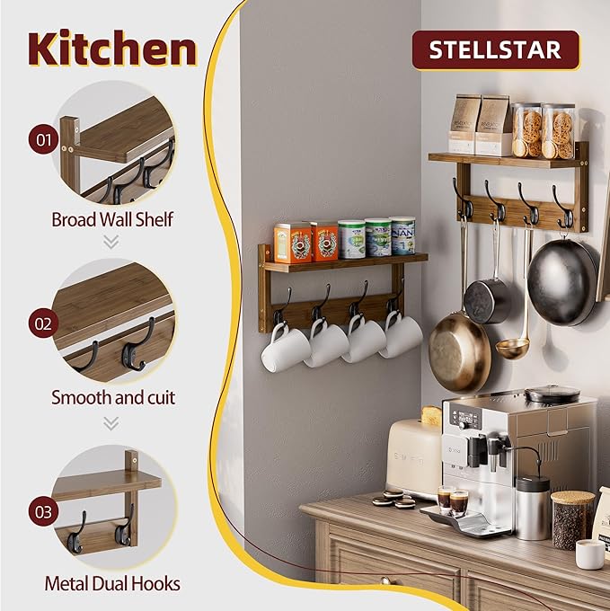- 8 DOUBLE HOOKS WITH SHELF:Boasting 8 dual-purpose hooks, it presents ample hanging space for various items like coats, hats, scarves, backpack, etc. The well-spaced hooks optimize space and prevent garment bunching. Each wall-mounted coat and key rack has a 15.75 x 4.3-inch (40x11 cm) top shelf, serving as a display area for decor, frames, plants, and a storage nook for collectibles, blending function and style