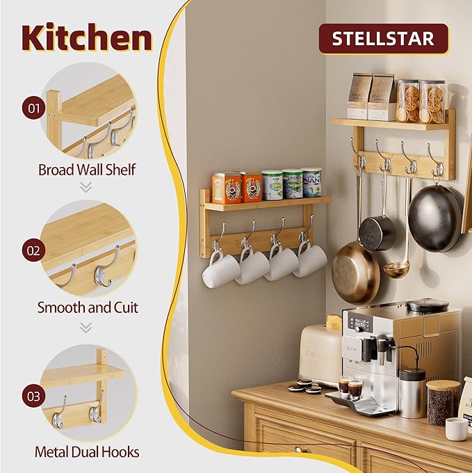 - FLEXIBLE INSTALLATION CHOICE: This pair of bamboo wall hangers presents a range of options. Place them side by side for a spacious hanging and display area, ideal for busy entryways or shared closets. Or assign them separately to rooms like the bedroom and bathroom to fulfill specific storage and decorative needs, tailoring your living spaces as desired