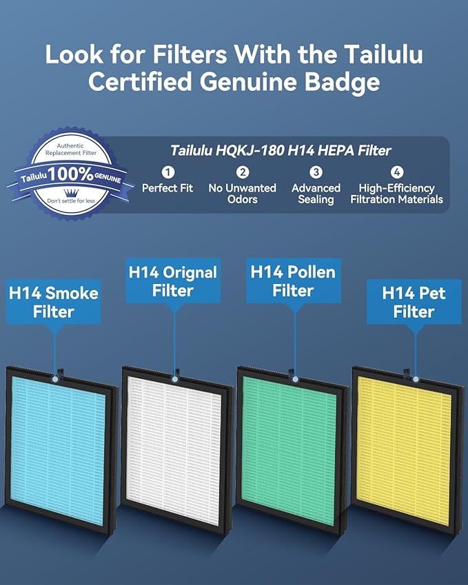 - [Filter Replacement Reminder] The Tailulu HQKJ-180 Air Purifier is equipped with a filter replacement reset indicator. When the filter's lifespan has expired, the indicator will illuminate. Press and hold the reset button for 3-5 seconds to reset the indicator after replace the filter. For optimal performance, we recommend changing the filter every 3-6 months, please use official Tailulu filters. (You can find it by searching for B0DHXC8CC3 or "Tailulu HQKJ-180 replacement filter" on Amazon.)